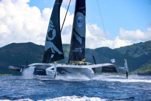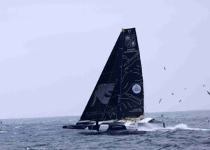Regardez bien cette photo qui peut vous paraître très habituelle, une simple image de grand trimaran. Elle a été prise à l’arrivée de la transat