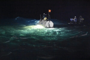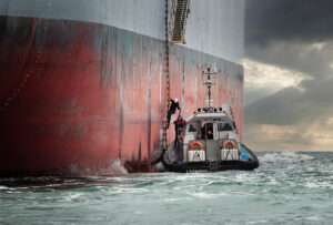 Sur la photo, un sauveteur passe une amarre pour le remorquage d’un bateau en détresse, au large du Cap d’Agde, lors d’une opération d’assistance de