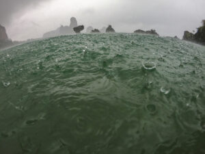De grosses gouttes, lourdes, frappent la surface des flots en la creusant pour faire de la place. Image fascinante de l’eau accueillant l’eau. Le salé