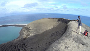 Le scientifique de la photo vit un privilège rare : explorer une terre nouvelle. Là, au sommet de cette île de l’archipel des Tonga, il