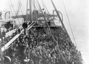 La photo date de 1906. Des hommes, des femmes, des enfants s’entassent sur le pont du Patricia, en route pour New York. Ils ont tout laissé