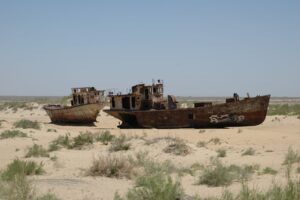 L’image est triste, mais se veut symbolique. Sur la mer d’Aral, où a été prise la photo, l’eau a disparu, détournée à l’époque soviétique au