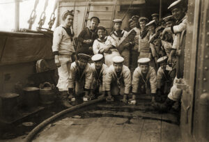 Ils ont l’air joyeux, mais ne vous y trompez pas : ce n’est que pour la photo. Les marins du navire de guerre anglais HMS Pandora,